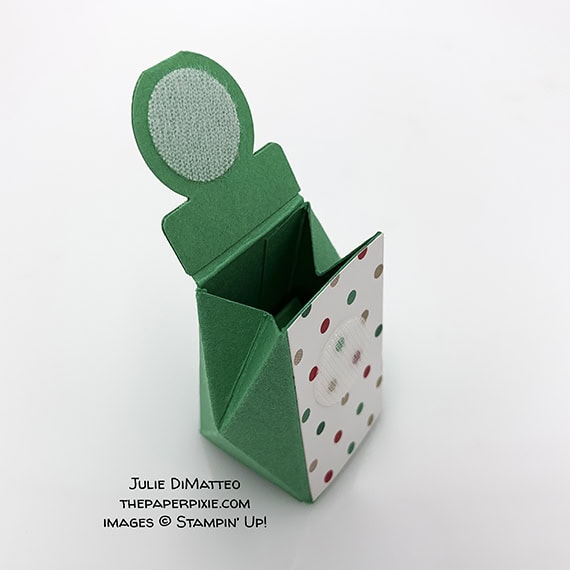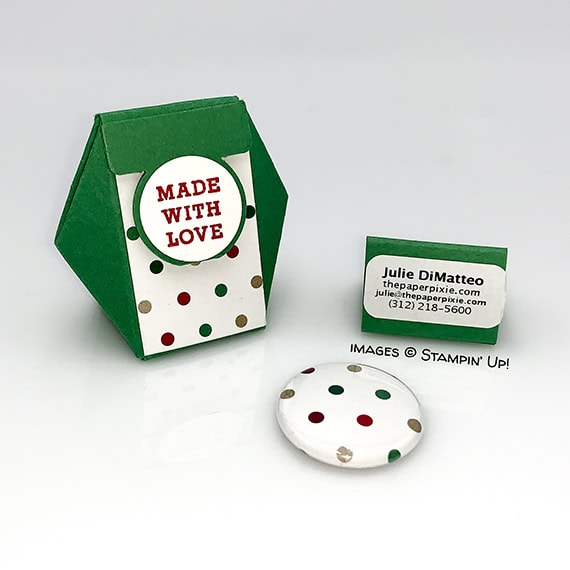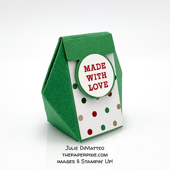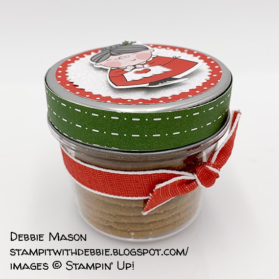 This cute little jar is full of gingersnaps! She used the Santa’s Workshop Specialty Designer Series Paper, Santa’s Signpost Framelits Dies, Sparkle Glimmer Paper, and Poppy Parade 1/2″ Textured Weave Ribbon.