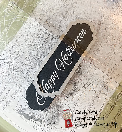 - second ghost adhered onto the box lid, as if coming out from behind the pumpkins, using Black Stampin’ Dimensionals