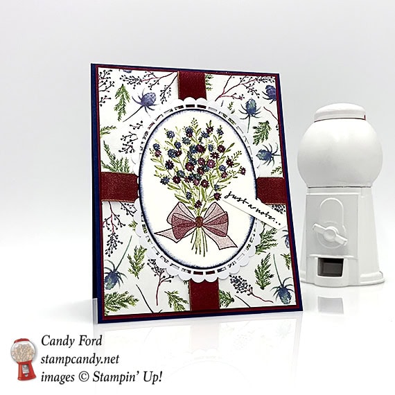 For today’s card I combined the Wishing You Well stamp set with the Frosted Floral Designer Series Paper, both from the 2018 Holiday Catalog. I added some ribbon and doilies to make this card pretty and lacy.