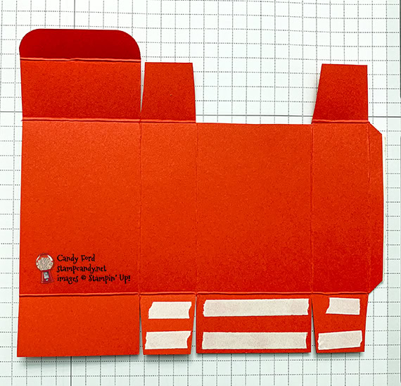 - Poppy Parade CS cut to 6-1/4″ x 5-1/2″, scored along the longer side at 1/4″, 1-1/4″, 3-1/4″, and 4-1/4″, and along the shorter side at 1″, 4″, and 5″ (See the diagram below. Remove all red areas with Paper Snips. Note that the smaller tabs are tapered and the wide ones have straight sides.)