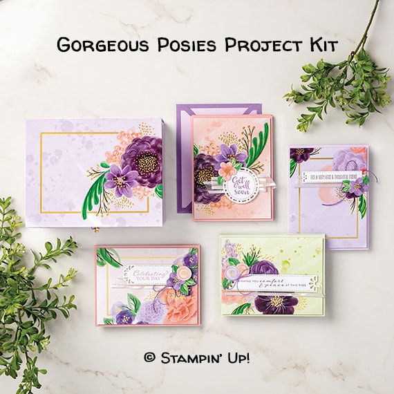 Today’s I’m sharing the Gorgeous Posies Project Kit. It makes 16 cards, 4 each of 4 designs, and they really are, well, gorgeous. I followed the kit instructions mostly. On some of the cards, I did use different sentiments from the Timeless Tulips and the Four Season Floral stamp sets. One of my favorite things about this kit is the box it comes in. I will definitely keep it in my office to hold assorted little items.