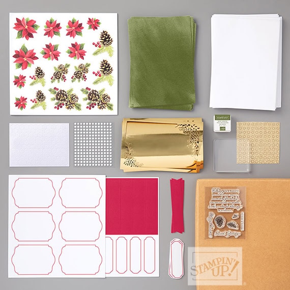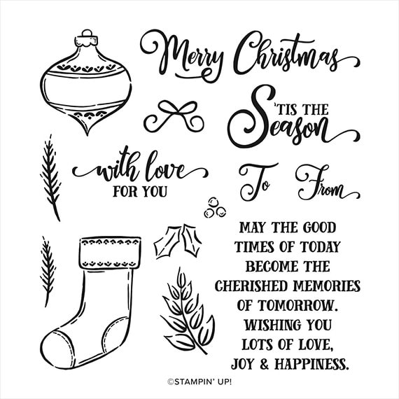 - sentiments in Garden Green, Real Red, and Shaded Spruce inks onto the included labels