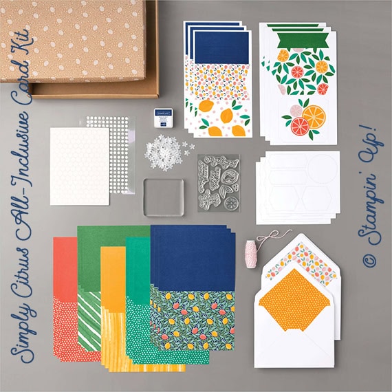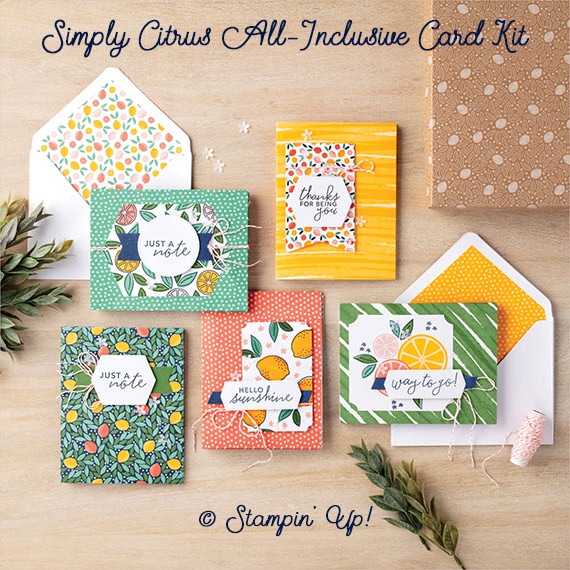 Today I’m sharing the cards I made using the Simply Citrus Card Kit. This kit is perfect for beginner stampers! It’s an all-inclusive kit, meaning it has everything you need to make the cards (except scissors to cut the twine.) You get the card bases, envelopes, die cut labels and images, stamp set, clear block, ink pad, embellishments, twine, adhesives, and a sweet box to hold it all. A lot of people could use a little sunshine these days. These 15 colorful and fun cards will help you send it to them.