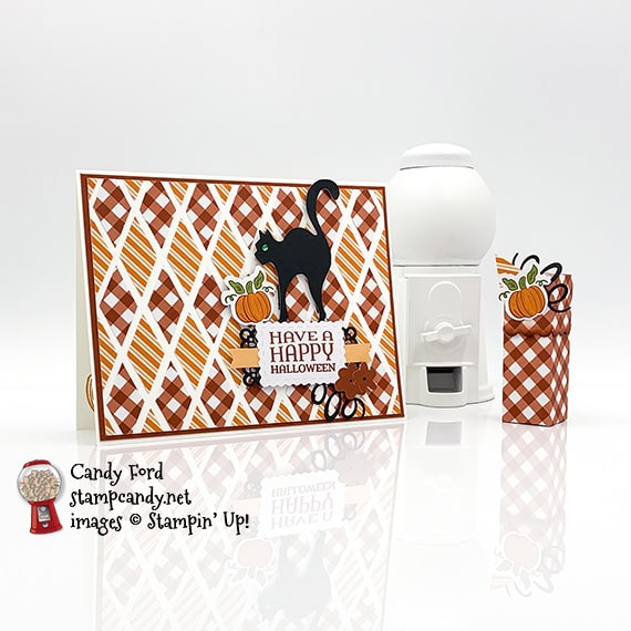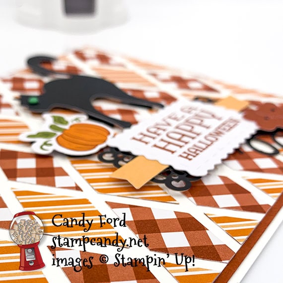 - small pumpkin die cut adhered onto the card front, next to the cat, using Black Stampin’ Dimensionals