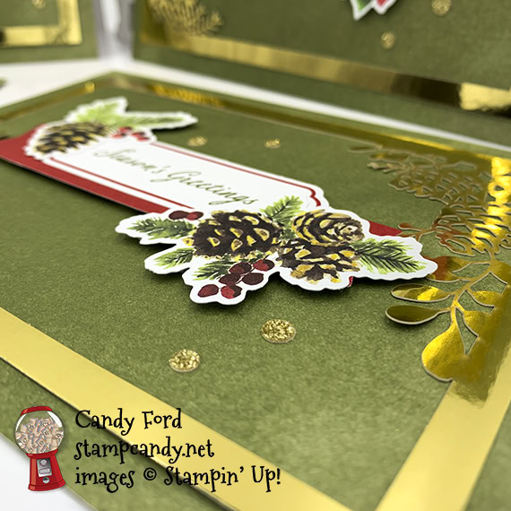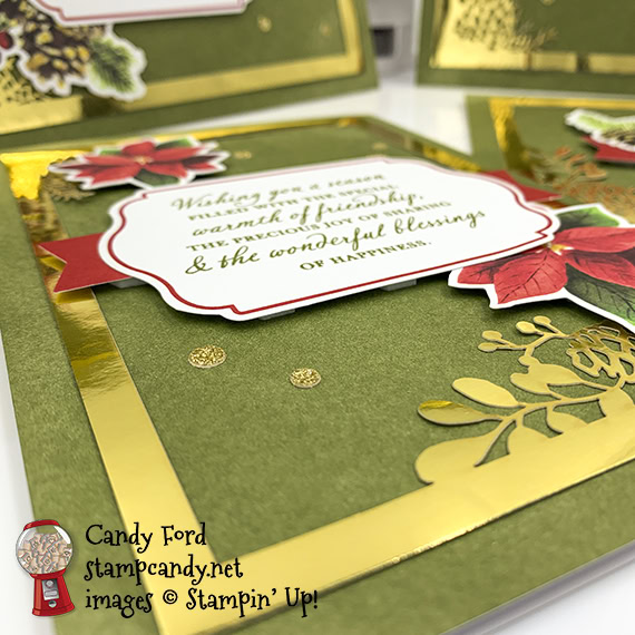 Today I’m sharing a sneak peek of the Joy of Sharing Card Kit from the August – December 2020 Mini Catalog. It’s an All-Inclusive kit, which means it contains everything you need to make the cards. The kraft box contains 15 card bases (5″ x 7″,) 15 envelopes, gold foil die cuts, printed die cuts and labels, stamp set, clear acrylic block, Mossy Meadow ink pad, gold glitter dots, and adhesives. You get way more of the die cuts than you need, so you can use them on even more projects, and really spread your Joy of Sharing this holiday season!