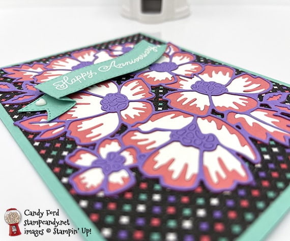 - banner adhered over the floral die cuts using glue on the ends and Stampin’ Dimensionals in the middle