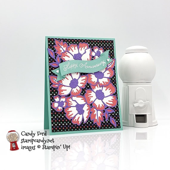 I used the new Always In My Heart bundle (Always in My Heart stamp set and Floral Heart Dies) along with the Many Layered Blossoms Dies, and True Love Designer Series Paper colored with Stampin’ Write Markers to create today’s Happy Anniversary card. I was in the mood to use some fun colors, so I opted for Coastal Cabana, Flirty Flamingo, and Highland Heather.