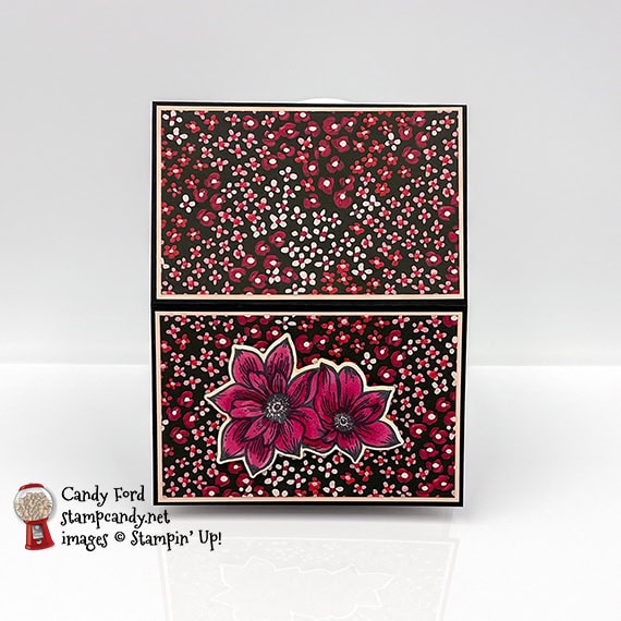 I used some new products for today’s easel card: delicate Petals Bundle (Delicate Petals stamp set and Lacy Petals Dies,) Pierced Blooms Dies (available in a bundle with the In Blooms stamp set,) and Flower & Field Designer Series Paper. The paper is a Sale-a-bration item you can free with a $50 order! The dies are small enough to use with the Mini Stampin’ Cut & Emboss Machine, which is now available to purchase!