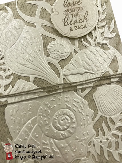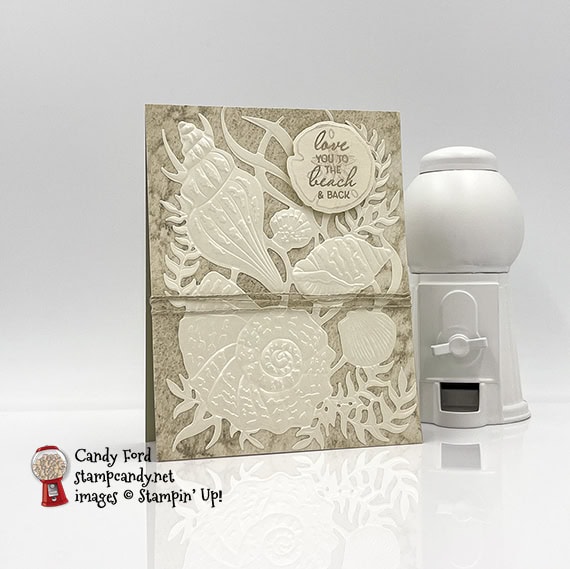 Today’s card is another one from my February Stamp Club gathering on Monday. The Seaside Seashells Dies, Seashells 3D Embossing Folder, and Pearlescent Specialty Paper are the real stars of this card. Just look at the texture on the pearlescent shells. Isn’t it beautiful? I also used the Friends Are Like Seashells stamp set and Sand & Sea Designer Series Paper from the same Sand & Sea Suite Collection.