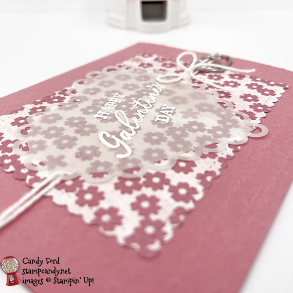 - white twine run scallop on the left side of the vellum heart, then wrapped around the front of the card base