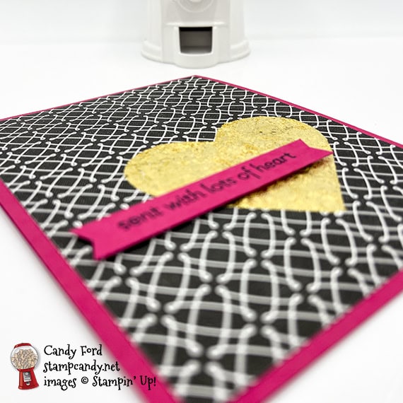 - sentiment strip adhered over the gilded heart using Black Stampin’ Dimensionals