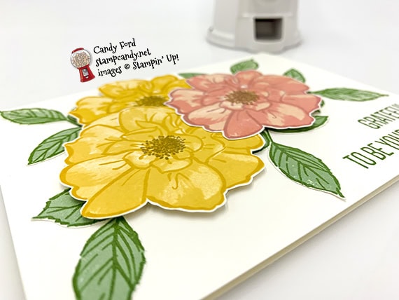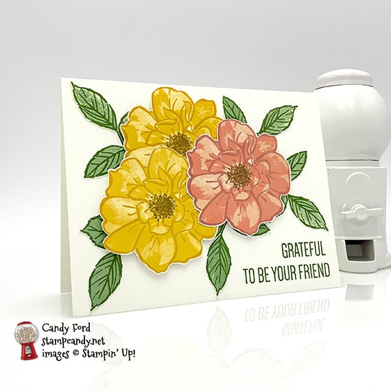 - roses glued together, then adhered onto the front of the card base using Stampin’ Dimensionals