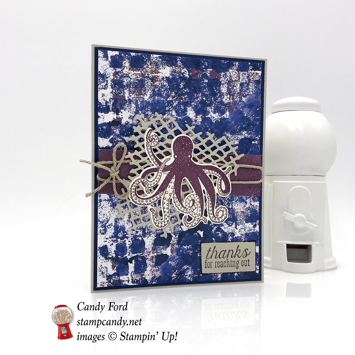 When you want to thank someone for reaching out to you, how better to do it than with an octopus? With eight legs, an octopus can to a lot of reaching out. I used the Sea of Textures bundle (Sea of Textures stamp set & Under the Sea Framelits Dies) along with the Tranquil Textures Designer Series Paper to create this nautical thank you card. The Crumb Cake twine, from the Nature’s Twine pack, is perfect for the look of nautical rope.