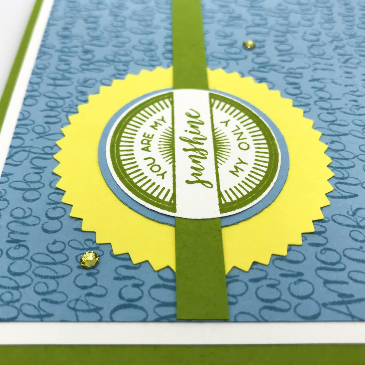 I used two new stamp sets and three new colors on today’s card. The Handwritten background stamp has so many different words in it’s adorable font, that it’s perfect for many different projects. The sentiment is from the Stitched All Around stamp set. Balmy Blue, Granny Apple Green, and Pineapple Punch join to make this card bright and cheerful.