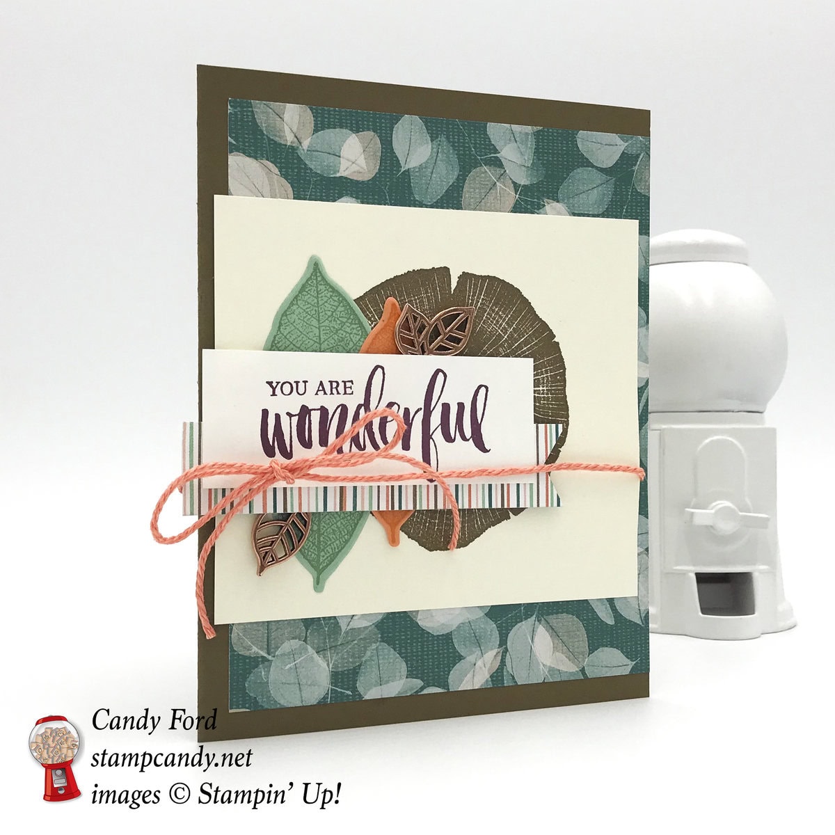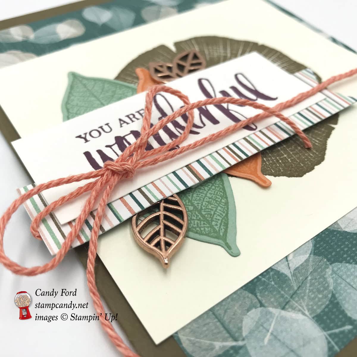 Today I’m sharing another Make & Take card from Stampin’ Up!’s recent OnStage event. You can see the first one here. We used the new Rooted in Nature bundle, Nature’s Poem Designer Series Paper, Natures Twine, and Leaves Trinkets. This is a really lovely suite of products. I know you’ll want it when you see it!