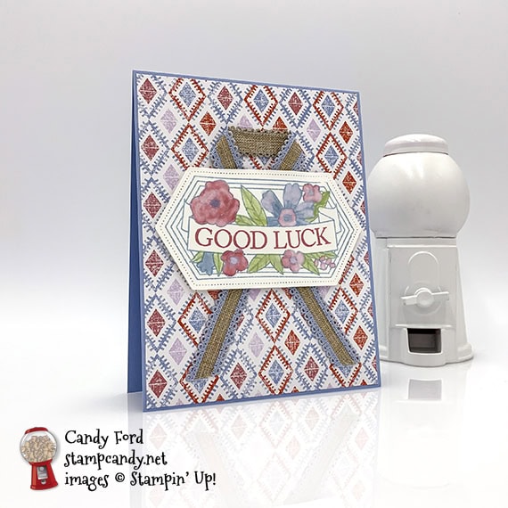 Today I’m sharing a card made with the Bloom & Grow stamp set and Botanical Tags Dies. The colors are from the Woven Threads Designer Series Paper I used, and some Pearl Basic Jewels colored with a Stampin’ Blends Marker finish off the card.