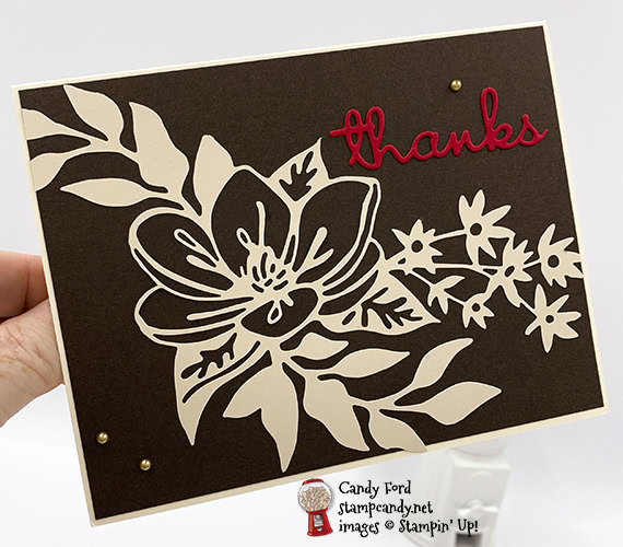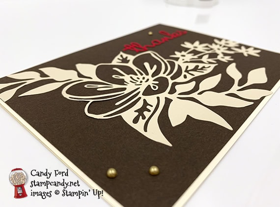 - shimmer laser-cut flower glued onto the Early Espresso CS layer, and excess trimmed away using Paper Snips