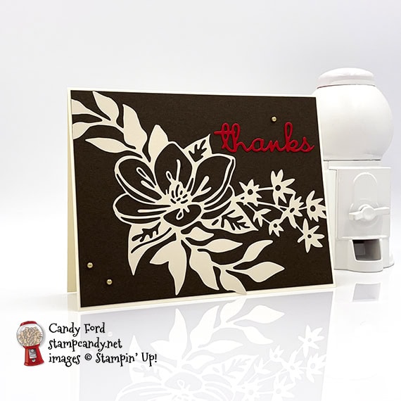 Today’s thank you card is really quick and easy. There isn’t even any stamping! The sentiment is cut using the Well Written Dies, and the floral design is from a piece of Shimmer Detailed Laser-Cut Specialty Paper. Three gold pearls finish off this simple design.