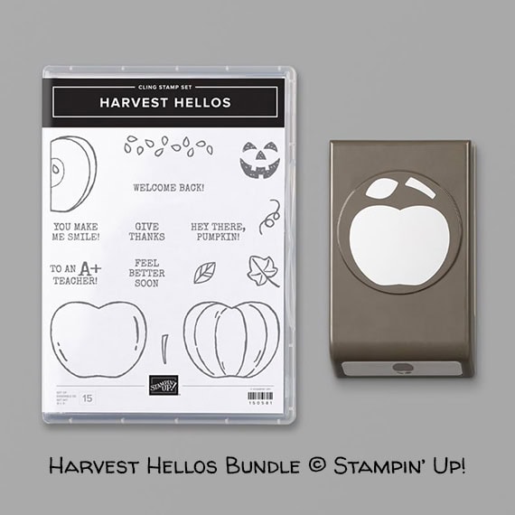 Today I’m excited to share with you a card I made using brand new products from the upcoming 2019 Holiday Catalog. I combined the Harvest Hellos Bundle (Harvest Hello stamp set and Apple Builder Punch,) the To Every Season stamp set (available in a bundle with the Every Season Punch Pack,) and the Come To Gather Designer Series Paper to make this Autumnal thankful-for-you card.