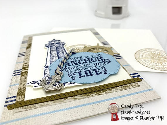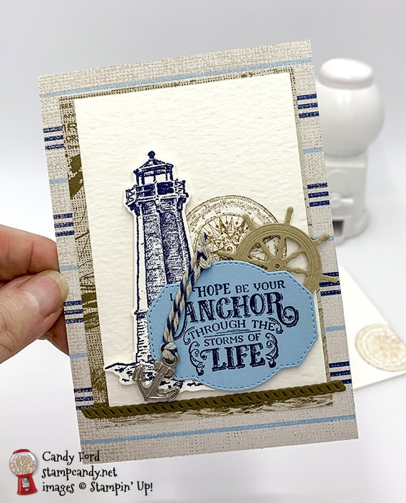 - sentiment, lighthouse, and helm glued together, then adhered onto the Watercolor Paper using Stampin’ Dimensionals