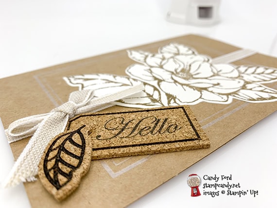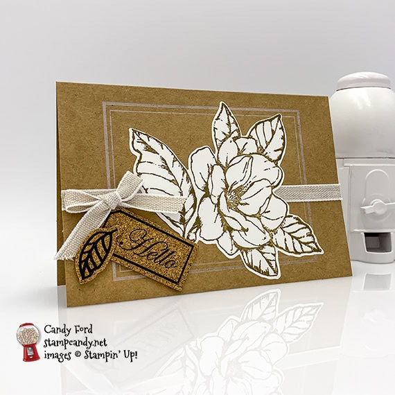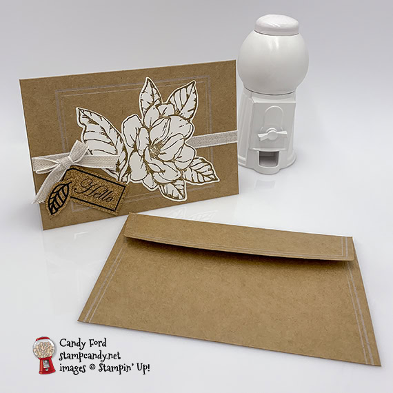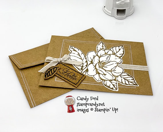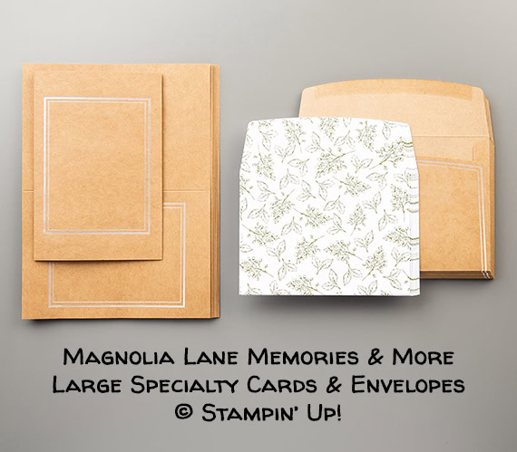 Premade cards and envelopes make your projects super quick and easy. For today’s card, I used the new Magnolia Lane Large Specialty Memories & More Cards & Envelopes along with the Good Morning Magnolia bundle (Good Morning Magnolia stamp set and Magnolia Memory Dies.) Both the cards and envelopes are kraft with white foil accents, and they even come with printed envelope liners that coordinate with the Magnolia Lane Suite.