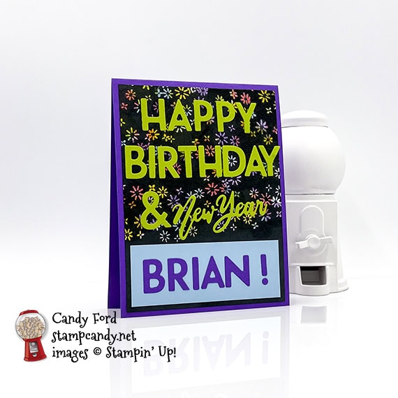 Judy’s card has a Berry Burst card base with a layer of Foil Frenzy Designer Series Paper. 2018 has been cut from the DSP layer with the Large Numbers Framelits Dies, then adhered with Foam Adhesive Strips. This is the Eclipse Technique. Metallic Edged Berry Burst Ribbon (a sneak peek from the upcoming 2018 Occasions Catalog) and a sentiment from the Teeny Tiny Wishes stamp set are the final touches.