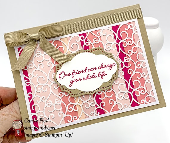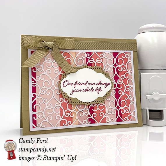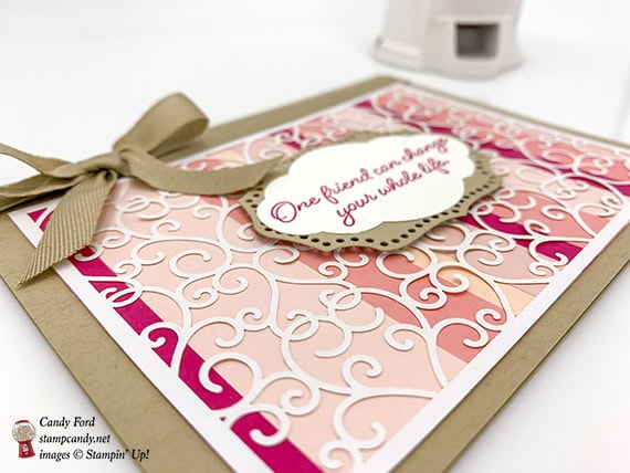 I save paper scraps, as most of us thrifty paper crafters do. I have a lot of paper scraps. I mean a LOT. I have a drawer for each color, and almost all of them are full. I also save extra pieces that I don’t end up using on projects. So I decided to use up some of them. You’ll see them on several of my cards in the near future, including today. See all those pink strips in the background? Those are card stock strips that had been cut off of other projects. The Delightfully Detailed Laser-Cut Designer Series Paper allows the pinks to show through while also tying them all together. The sentiment, from the Flowing Fountain stamp set, was cut using the Pretty Label Punch. And that’s on a piece of cardstock cut using the gorgeous label die from the Rose Trellis Thinlits Dies.