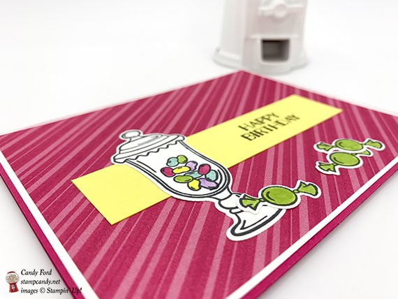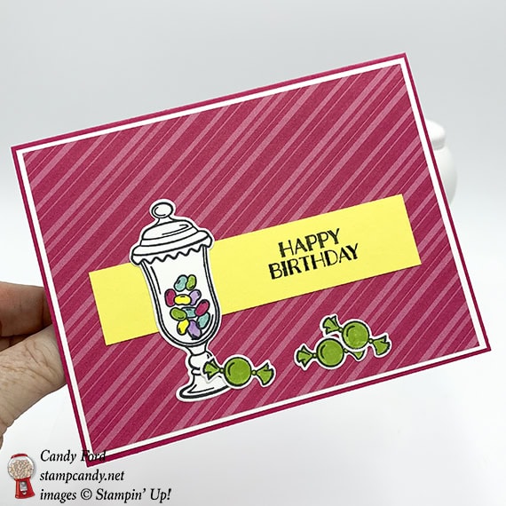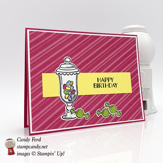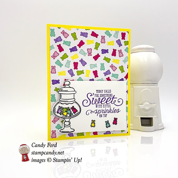 Today I’m sharing another fun card I made with the Sweetest Thing stamp set, Jar of Sweets Framelits Dies, and How Sweet It Is Designer Series Paper. I just love the colors in this set. They’re all so fun and happy. I used a scrap of Pineapple Punch cardstock – right out of the scrap drawer – for the sentiment, continuing my quest to use up a bunch of my scraps. I used Stampin’ Write Markers to color in the candies. While Gorgeous Grape is the purple used in the paper, I used a Highland Heather marker instead, because I thought the Gorgeous Grape would be too dark in this instance. You could use Gorgeous Grape with a Blender Pen to lighten it up.
