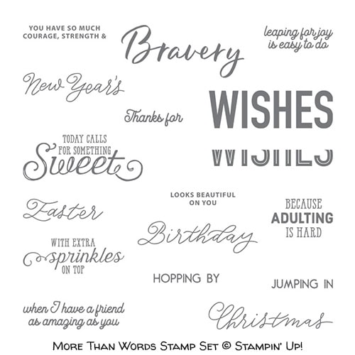 The new More Than Words stamp set is only available through March 31, or while supplies last. It has some great sentiments for different occasions, in different fonts, that can be used with many other Stampin’ Up! products.