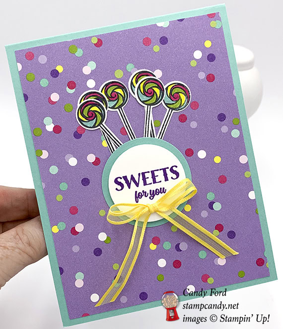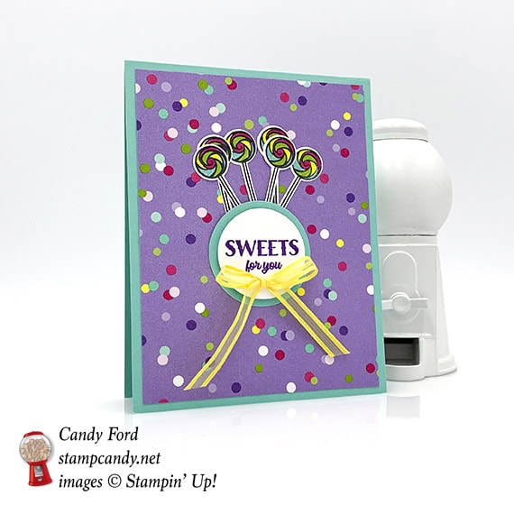 I have been playing with the How Sweet It Is suite of products a lot lately, and why not? It’s adorable and fun. The colors are bright and cheerful. I used it to made today’s card with confetti dots and lollipops that says Sweets for You. I used a piece of the Organdy Ribbon Combo pack that has now sold out. If you didn’t get it in time, you can easily replace it with one of the many other ribbons we have. I would suggest the Pineapple Punch 1/4″ Grosgrain Ribbon.
