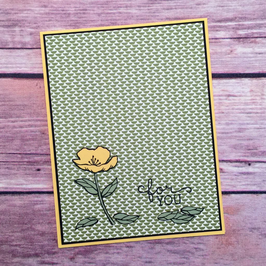 The card base is Daffodil Delight CS, with a layer of Basic Black CS, and a top layer from the Pretty Petals Designer Series Paper Stack. I stamped the sentiment in Basic Black directly on the card front, and I glued the flower and leaves onto the card front.