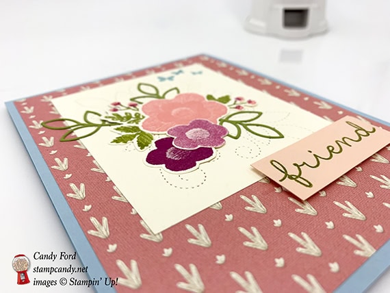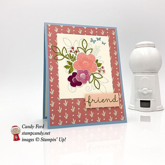The new Needlepoint Nook suite in the 2019 Occasions catalog is beautiful. Nothing says handmade like stitchery! It reminds me of being a young girl and learning to sew and embroider with my mother, and to needlepoint with my aunt Edna. I’ve used the Needle & Thread stamp set and Needlepoint Elements Framelits Dies (buy together and save 10%) with the Needlepoint Nook Designer Series Paper to create this sweet friend card.