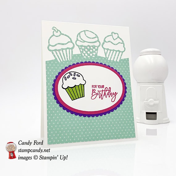 Today’s card is another one I made using the new Birthday Cheer bundle. You can see the first one here. I used a piece of the new How Sweet It Is Designer Series Paper for the background, and took the remaining colors from that paper pack. These new products will be available January 3 – that’s just 6 days away! The Layering Ovals Framelits Dies added the perfect base for the sentiment and stamped cupcake.