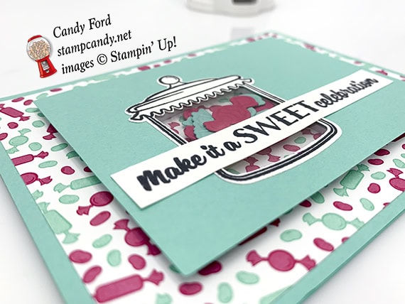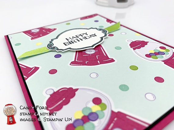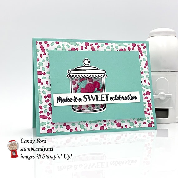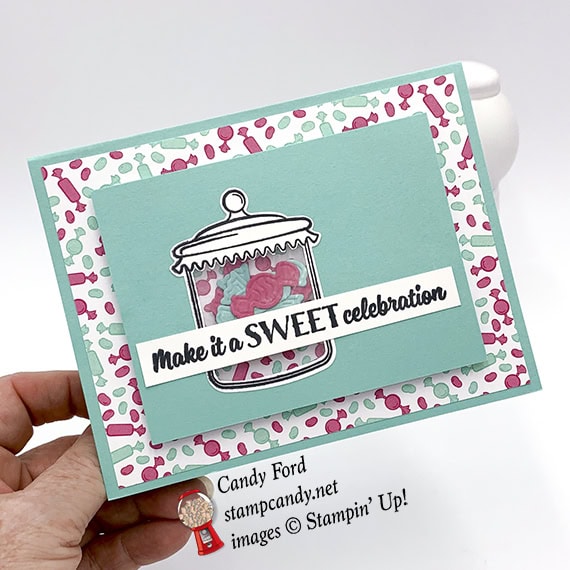 Have you seen the How Sweet It Is suite in the new Occasions catalog? It’s all about candy! At OnStage Orlando in November, there must have been 30 people who came up to me and said, “There’s a whole suite all about you!” While I’m sure I wasn’t on the designer’s mind when they created this suite, it really is perfect for me, don’t you think? There’s even a paper with gumball machines on it! Today’s project is made using this suite. It’s a shaker card you can use for a birthday or any other celebration.