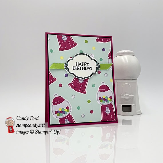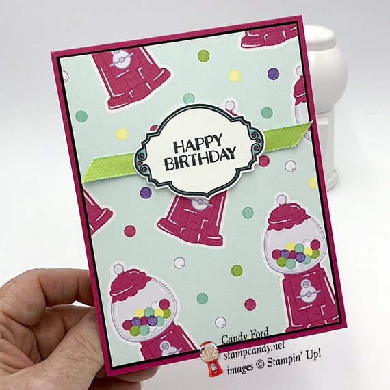 Today I have a very simple card for you. It’s a birthday card made with the Sweetest Thing bundle and How Sweet It Is Designer Series Paper. I stamped the label in black ink, then colored in the decorative edges with markers in Coastal Cabana and Melon Mambo. A simple piece of ribbon is the only embellishment. Of course, the paper is so decorative with the cute gumball machines, a lot of embellishment isn’t necessary.