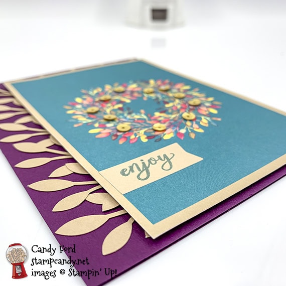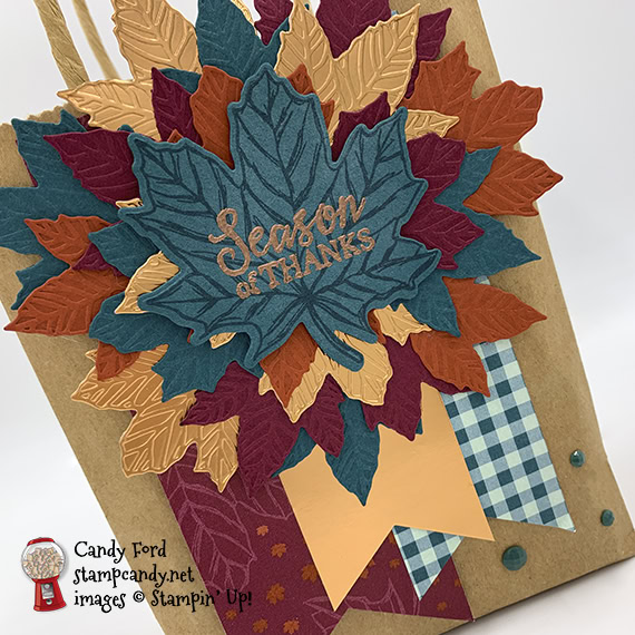 I was going to use the Come To Gather Ribbon Combo Pack as well, but I got so carried away with the leaves, I didn’t think it needed it. I used each embossed leaf die (3 in the set) to cut two each of four colors – and I used 18 of the 24 leaves I cut! Guess I just couldn’t stop until I had a big leaf pile! Doesn’t it make you want to jump in and scatter them?