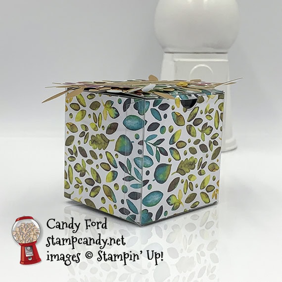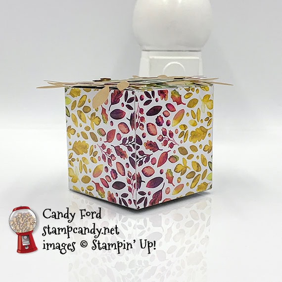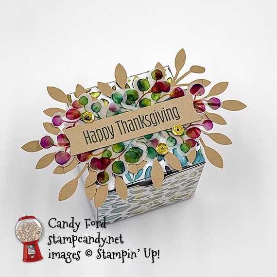 sentiment banner/vellum/leaves adhered onto the top of the box using Tear & Tape (you can use the glue dots that came in the kit)