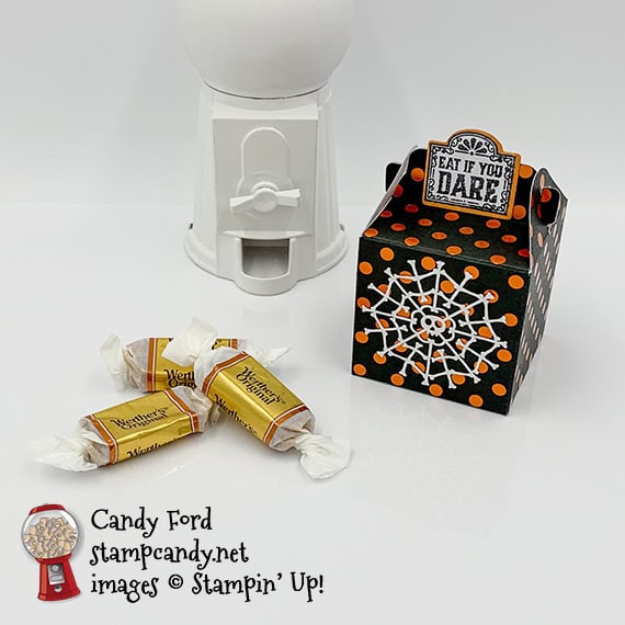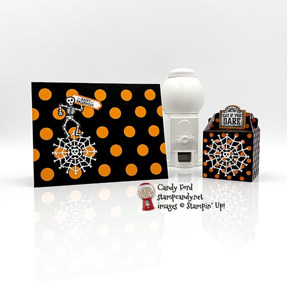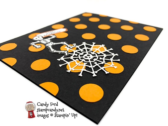 It’s time for the APPT Blog Hop for September! This month’s kit is called Bone Appétit, and it makes adorable treat boxes. I used the kit to decorate one of the boxes a little differently from the directions in the Bone Appétit kit, and to make a card that mimics the dots on the box. I love the intricate die cut “webs” of bones. And the die cut skeletons are so cute! The one on my card is holding a sign with the greeting, “Happy Halloween,” which is just one of several great sentiments in the Bone Appétit stamp set. I’ll be using this stamp set a lot, since our Halloween party theme this year is Bones!