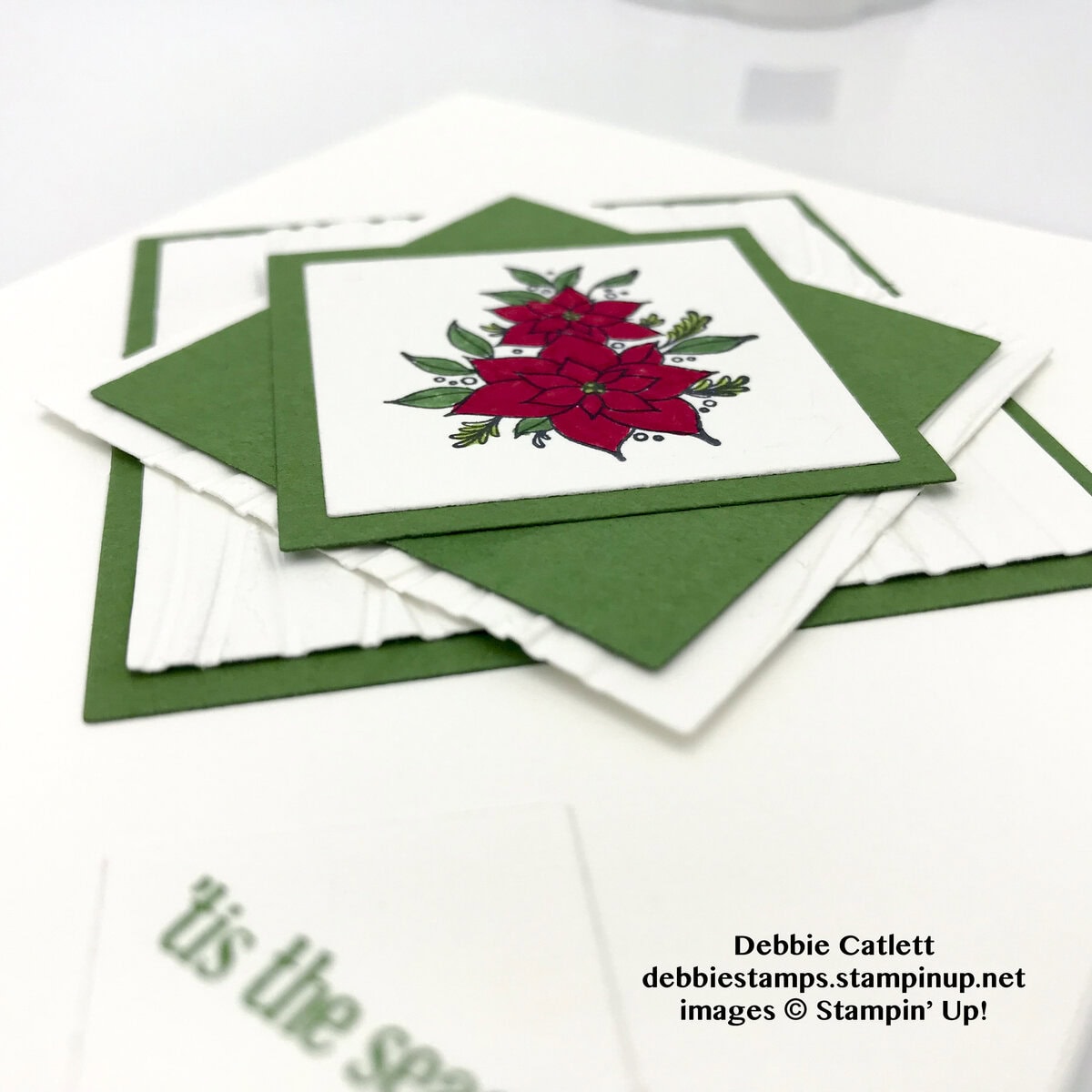 For today’s card I’m sharing a card made by Debbie Catlett for our July Candy Hearts team meeting. She used the In Every Season stamp set, Layering Squares Framelits Dies, and the Seaside embossing folder to create this lovely Christmas card.