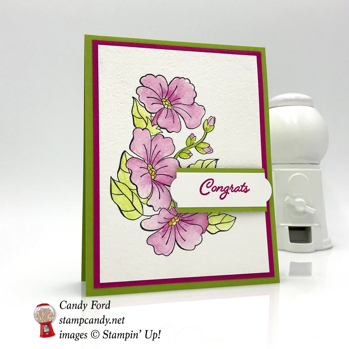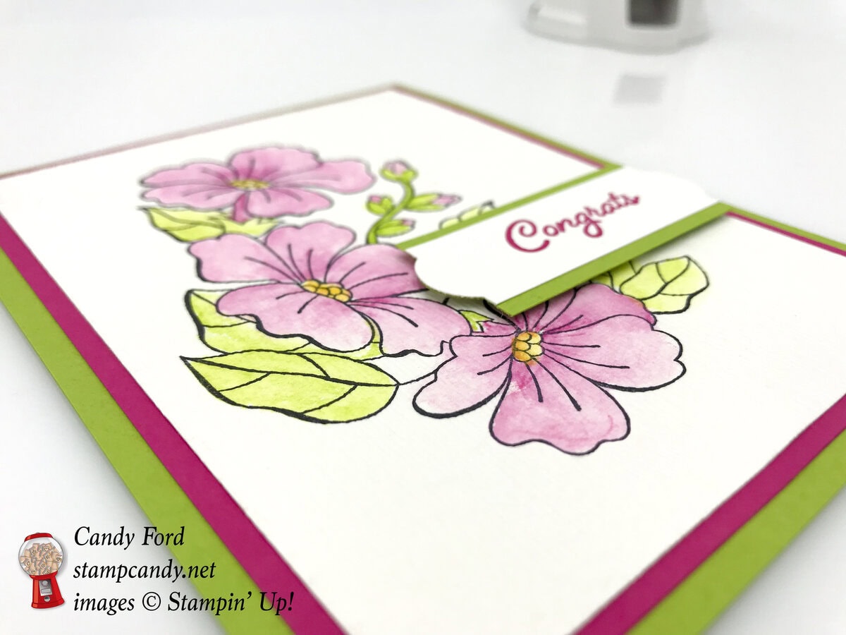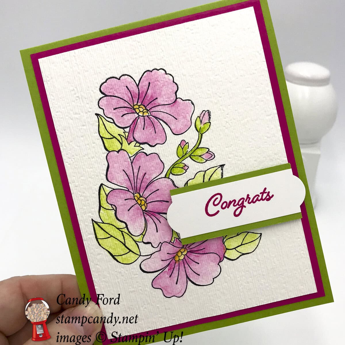 The Color Your Seasons promotion lasts through August 31, or while supplies last. Translation: get it now! The Blended Seasons bundle (Blended Seasons stamp set and Stitched Seasons Framelits Dies) have images for all year round. The new Watercolor Pencils Assortment #2 has some beautiful colors that you do not want to be without! I used the stamp set and pencils along with watercolor paper and the Everyday Label Punch to create today’s card for my August Stamp Club.