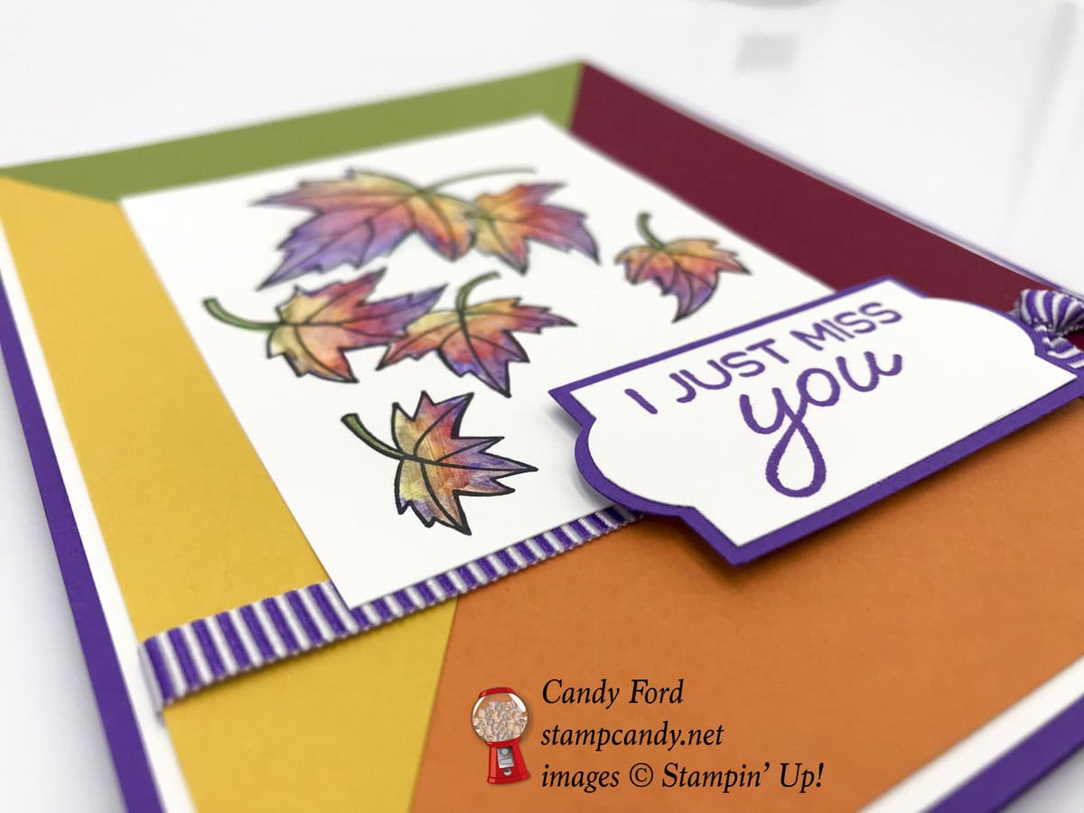 - Gorgeous Grape 1/4″Mini-Striped Ribbon wrapped around the multicolor pieced layer and adhered on the back using Tear & Tape (or Snail)