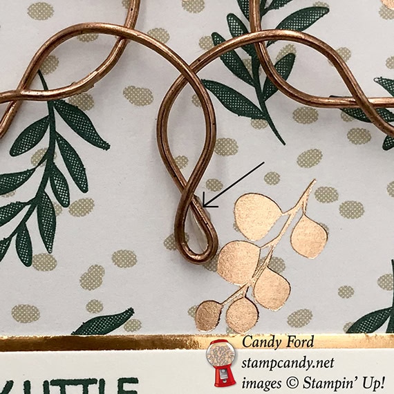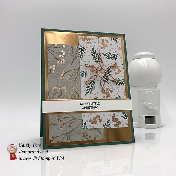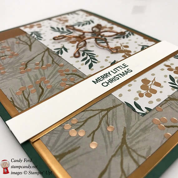 The Joyous Noel Designer Series Paper (DSP) has 7 colors in the pack. Today’s card used all but one of them. (Don’t worry, you’ll see Merry Merlot on tomorrow’s card.) It’s a simple card, using straight cut pieces of paper (no die cutting,) one stamp, and a copper wire element.