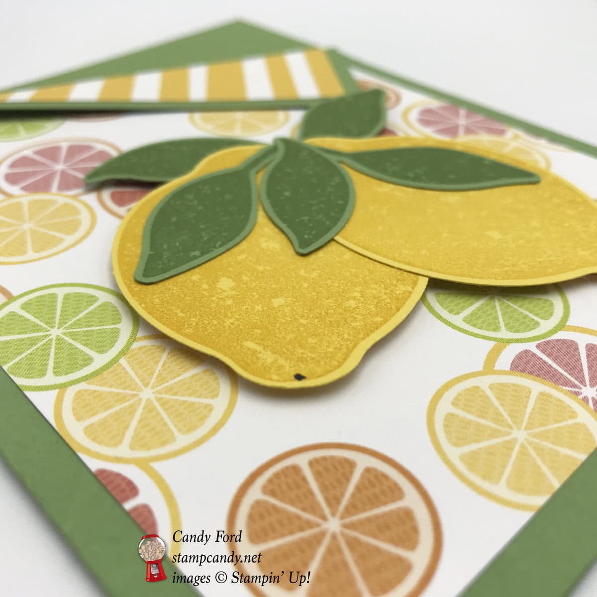 - lemons and leaves glued together, then adhered to the Tutti-frutti DSP (fruit) using Stampin’ Dimensionals