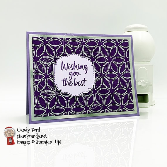 Today’s card is one that we made at my March Stamp Club gathering. I used the Tags In Bloom stamp set, Label Me Lovely Punch, and Flowering Foils Specialty Designer Series Paper. To get the deep color, I rubbed the ink pad directly across the paper, then rubbed off any excess with a paper towel. The silver foil flowers resist the ink, so I only changed the background color.