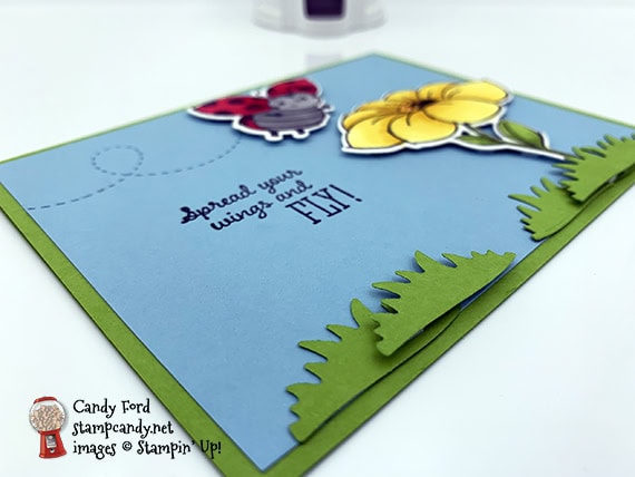 - ladybug and flowers adhered onto the Balmy Blue CS layer using Stampin’ Dimensionals