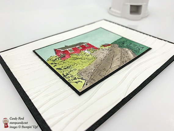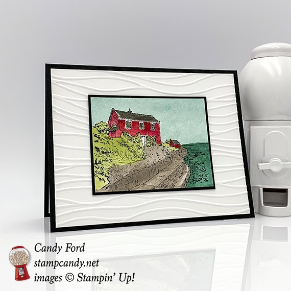 Today I’m sharing another card I made using the By the Bay stamp set with inks and an Aqua Painter. I used the same colors to watercolor the stamped image as I did before, but I cropped it down and matted it with Basic Black cardstock and put it on an background embossed with the Seaside Textured Impressions Embossing Folder. It’s amazing to me how different the two cards look. You can see the first one here.