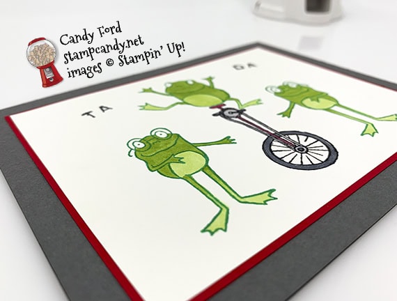 - frog on unicycle in Call Me Clover and Basic Black inks (colored the stamp using Stampin’ Write Markers)
