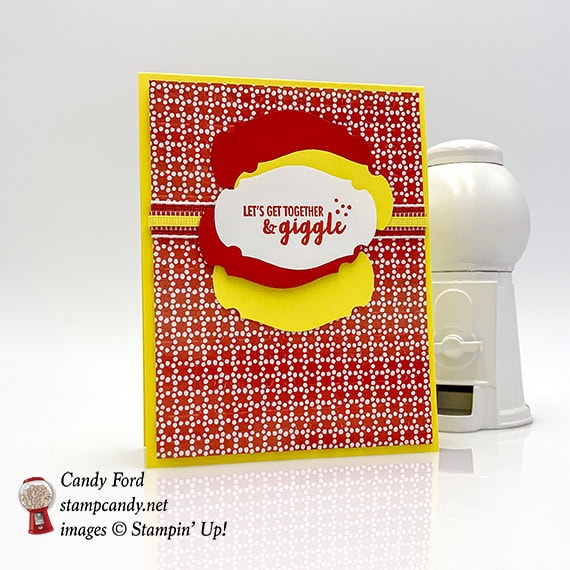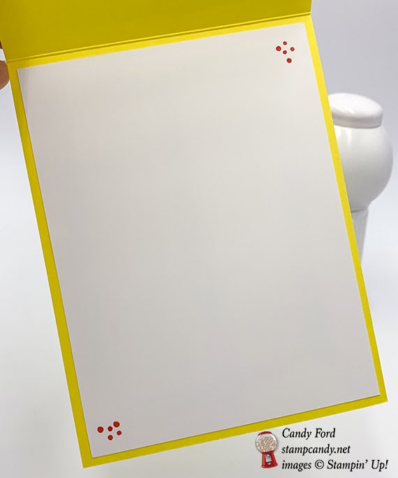 - just the dots from the sentiment stamp in Poppy Parade ink onto the 4″ x 5-1/4″ Whisper White CS