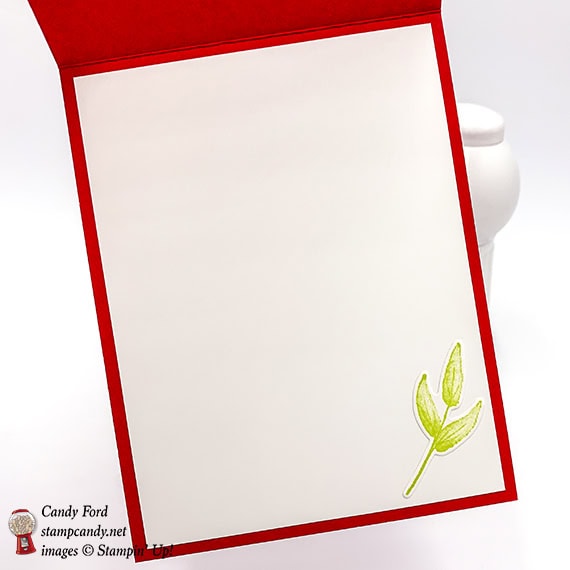 - NOTE: You can stamp 12 leaves on the scrap for die cutting, and the 13th directly onto the Whisper White CS for the inside of the card. I just happened to cut an extra leaf, so I used it on the inside.
