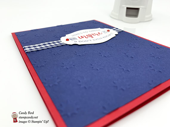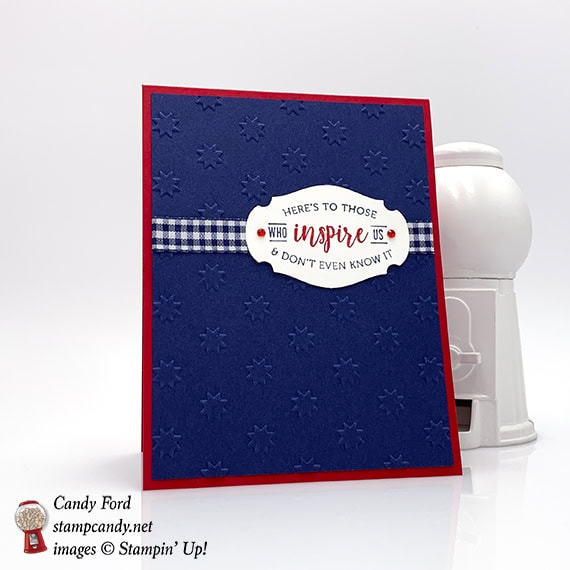 I made today’s card using the Part of My Story stamp set and the Story Label Punch, along with the Oh My Stars embossing folder. The sentiment made me think of patriotic heroes, which is why I used the red, white, and blue color scheme. The star embossed background, gingham ribbon, and Red Rhinestones added to the patriotic feel (think checkered tablecloths and fireworks on the 4th of July.) Of course, anyone can inspire you, and you could make this card with any color combination you like.